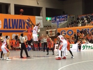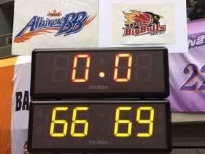 岩手もペースに乗れない中、新潟#1トーマスがブザービーターを決め同点にする。