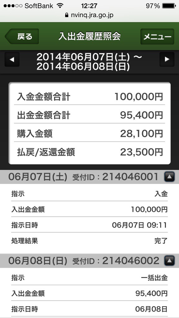 JRA資産運用6月7、8日 利殖支援ソフト諭吉くん X Facebook はてブ Pocket LINE コピー 2014.06.082014.06.29 利殖支援ソフト‘RuDolf’を使用し資産運用してます。 この土、日曜は4600円の損失でした。 事前に統計を取り、充分なシミュレーションにより自分なりの馬券購入方法を設定し自動購入します。