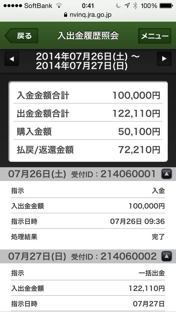 JRA資産運用7月26、27日 利殖支援ソフト諭吉くん X Facebook はてブ Pocket LINE コピー 2014.07.272014.08.16 利殖支援ソフト‘RuDolf’を使用し資産運用してます。 この土、日曜は22110円の利益でした。 事前に統計を取り、充分なシミュレーションにより自分なりの馬券購入方法を設定し自動購入します。